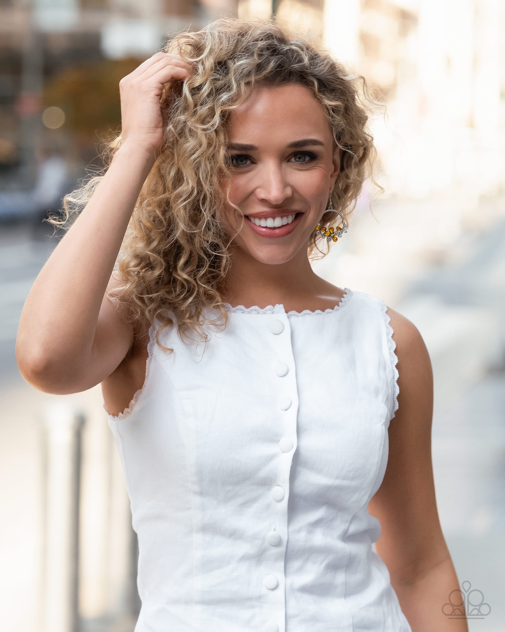 Featured along the bottom of a white rhinestone-encrusted silver hoop, two butterflies with wings of yellow and white gem teardrops and white rhinestones flutter beside a flower featuring yellow teardrop gem and white rhinestone-dusted petals and a dainty pearl centerpiece for a whimsical look. An additional solitaire pearl intersects between one of the butterflies and the center flower for a refined finish. Earring attaches to a standard fishhook fitting.