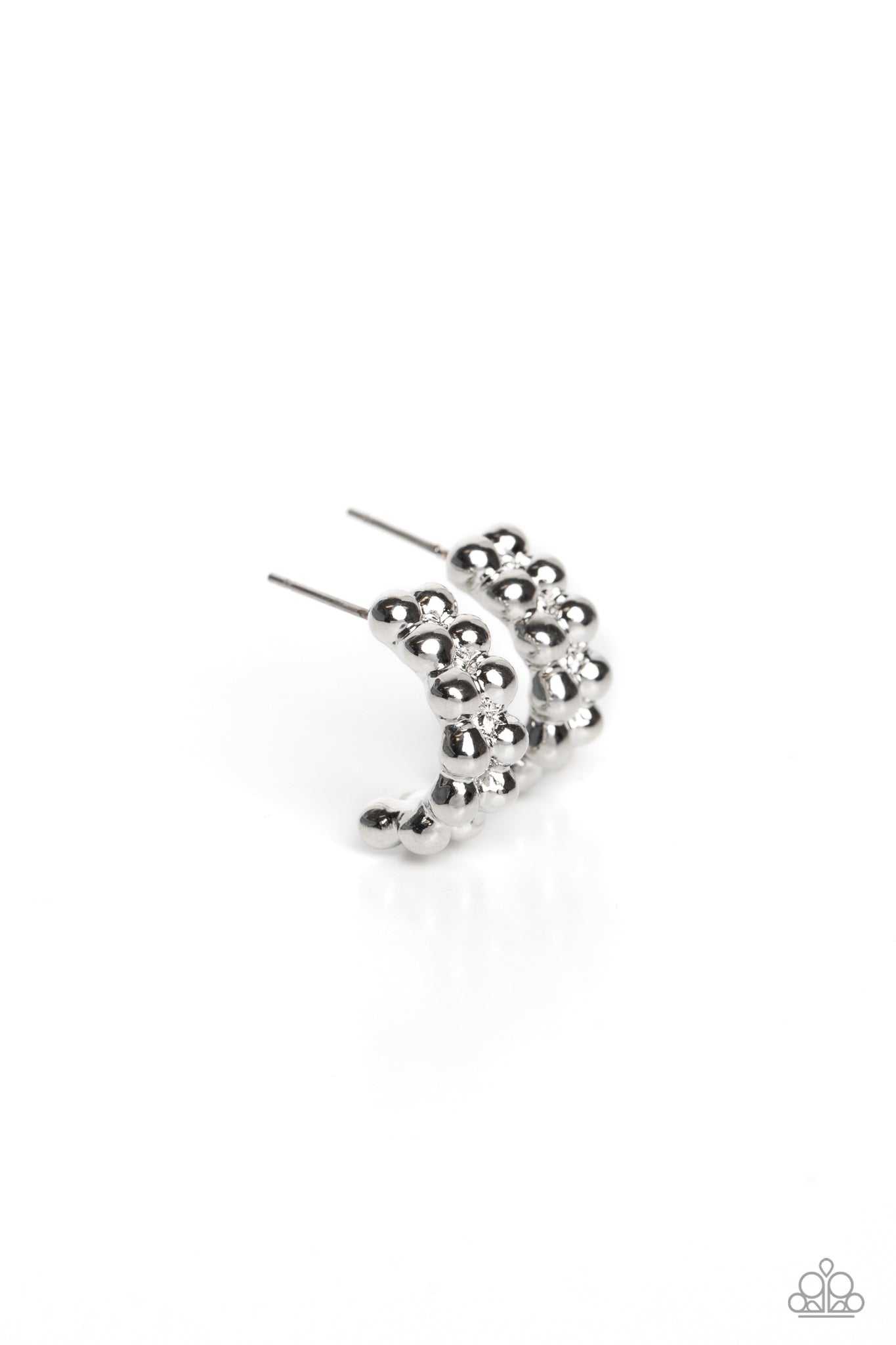Two rows of silver stack and form into a scalloped pattern. Daintily curling around the ear, the bubbly effect of the high-sheen metal creates a radiant, monochromatic hoop. Earring attaches to a standard post fitting. Hoop measures approximately 1/2" in diameter.