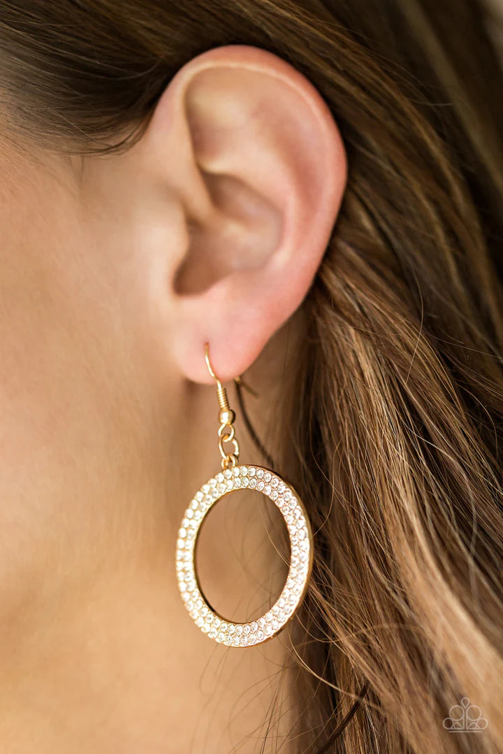 Two rows of glittery white rhinestones are encrusted along a shimmery gold circle, creating a bubbly frame. Earring attaches to a standard fishhook fitting.