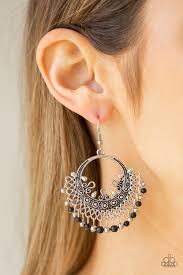 A fringe of dainty silver beads and earthy black stone beads swing from the bottom of an ornate silver hoop dotted in stunning detail for a seasonal flair. Earring attaches to a standard fishhook fitting.