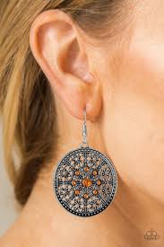 Shimmery silver filigree swirls into an ornate snowflake pattern. Glittery orange rhinestones are pressed into the ornate center for a regal finish. Earring attaches to a standard fishhook fitting.