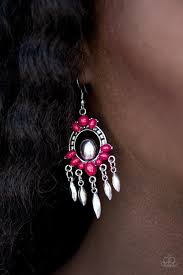 Shiny pink beads add tiny splashes of color to an antiqued silver frame. Brushed in a high-matte finish, faceted silver beads dangle from the bottom of the frame for a whimsical finish. Earring attaches to a standard fishhook fitting.
