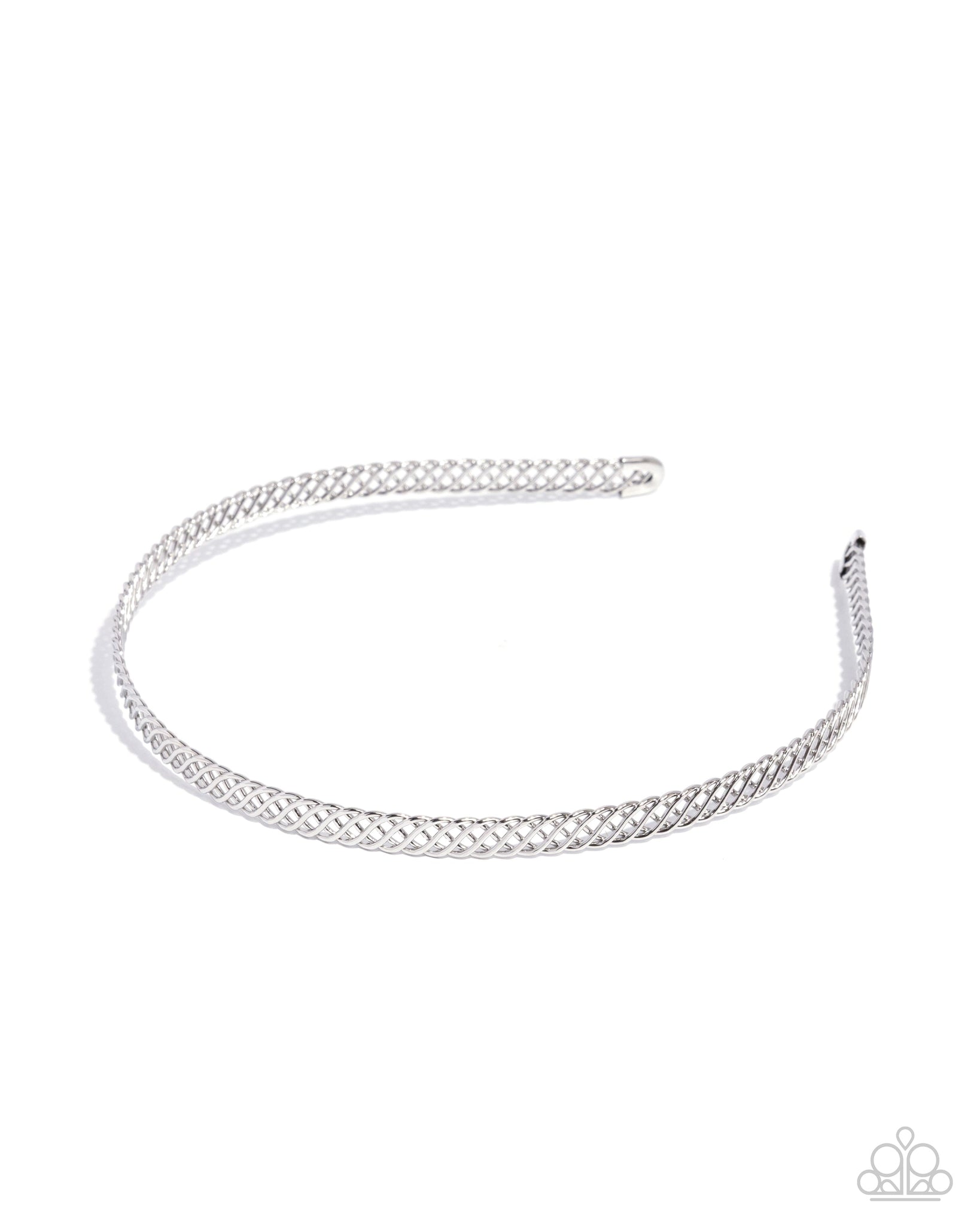 Delicately wrapped around a silver band, a glistening, braided silver ribbon curls atop the head, evoking a polished, preppy look.
