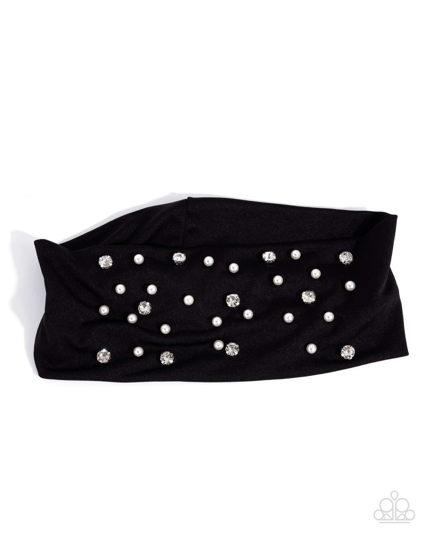Featuring copious glossy white pearls and silver-pronged white rhinestones, a black soft fabric headband curls atop the head, evoking a pretty, polished look.
