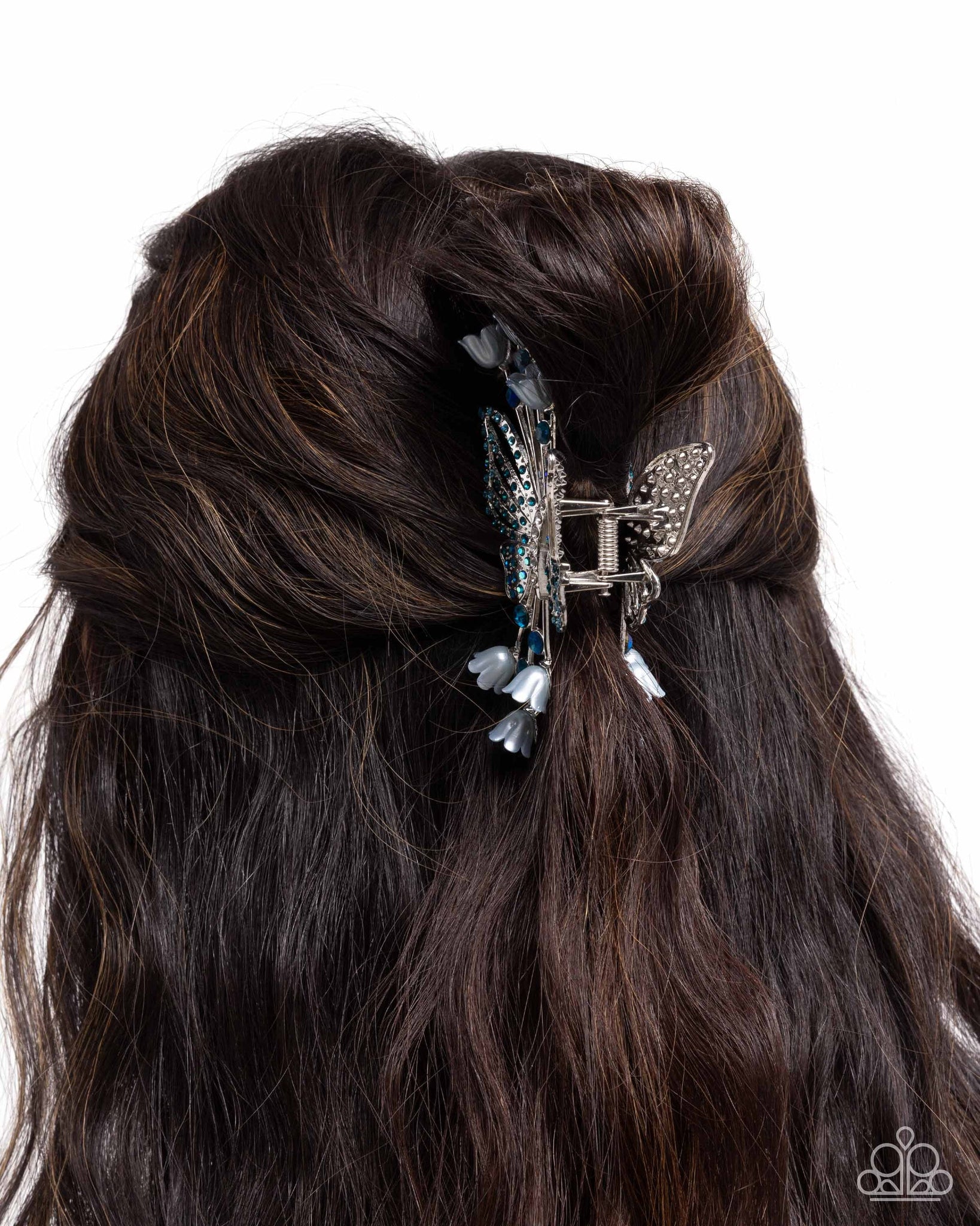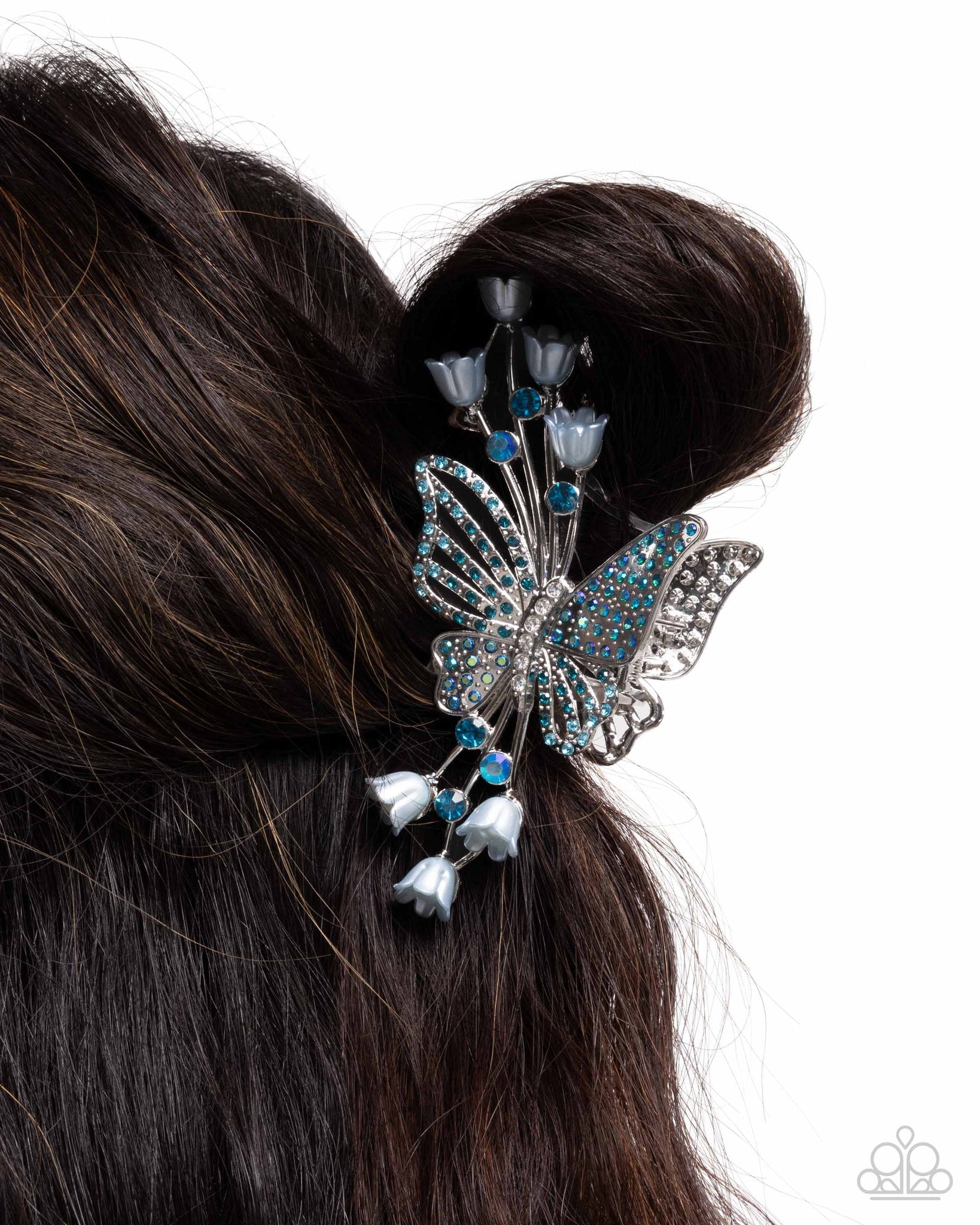 Featuring aquamarine, blue zircon, white, and blue zircon iridescent rhinestones, a textured silver butterfly claw clip flutters beside Limpet Shell pearl tulips and solitaire blue zircon and blue zircon iridescent rhinestones, holding the hair away from the face for an on-the-go whimsical display. Clip measures approximately 4 1/4" in length and 2 1/4" in width. Due to its prismatic palette, color may vary.