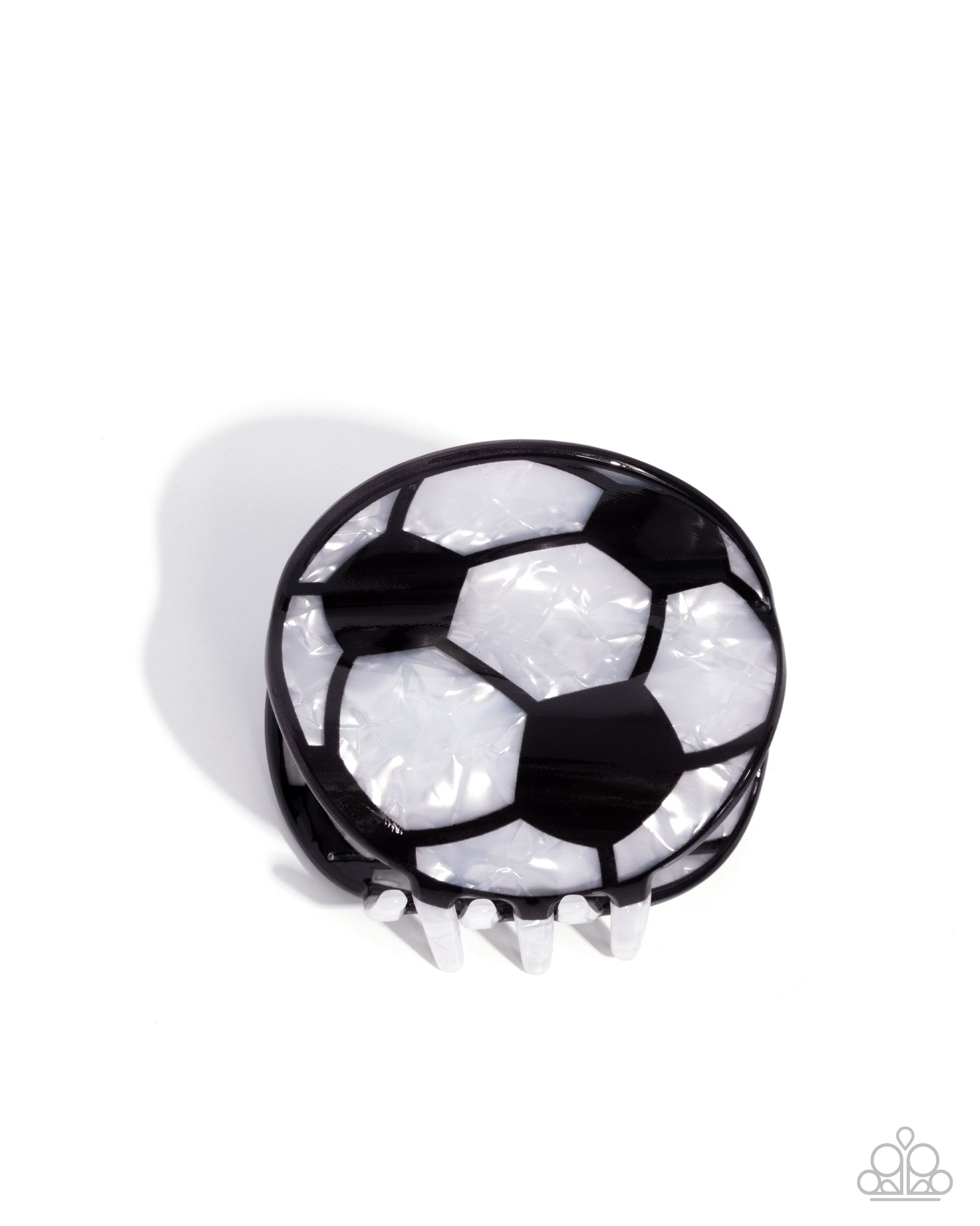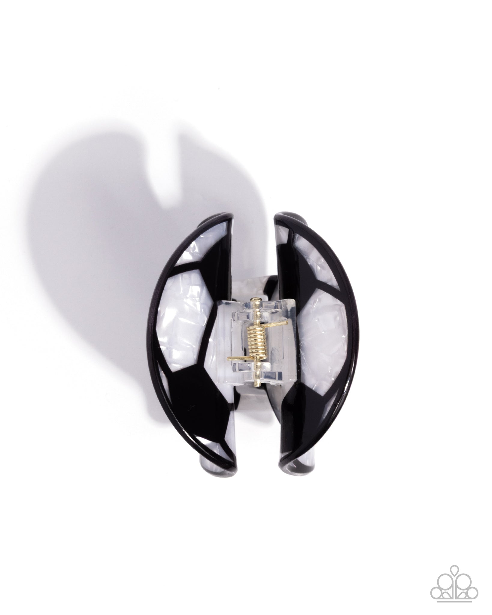 Resembling a classic soccer ball, black and white acrylic sections coalesce into a circular frame. The marbled white detailing adds a pop of contrast, creating a sporty accessory for any hairstyle. Clip measures approximately 2 1/2" in length and 2" in width.