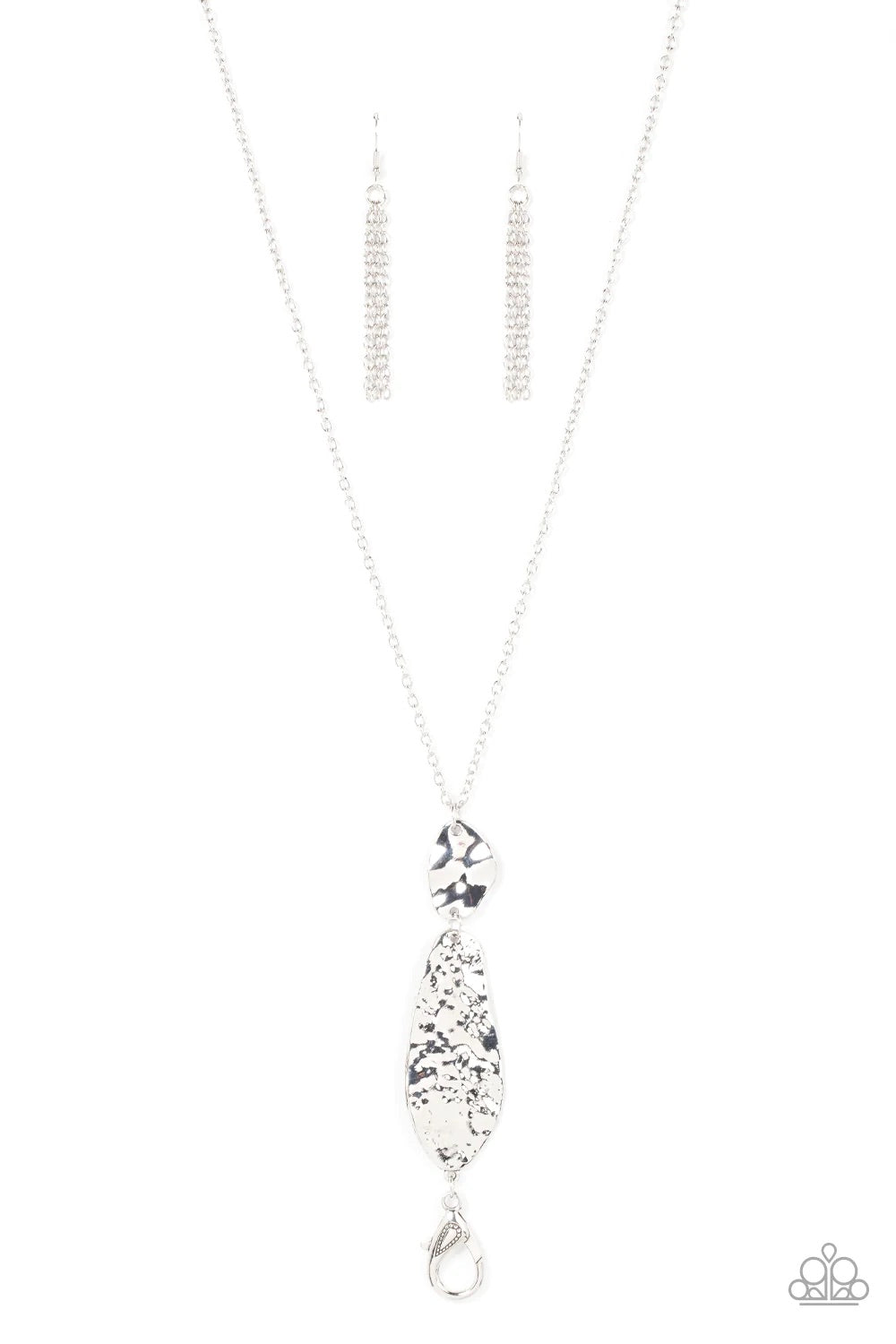 Hammered in bold rustic finishes, asymmetrical silver plates link at the bottom of a lengthened silver chain for an artisan inspired look. A lobster clasp hangs from the bottom of the design to allow a name badge or other item to be attached. Features an adjustable clasp closure.