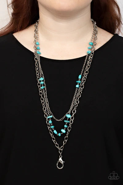 Infused with sections of refreshing turquoise stones, a trio of mismatched silver chains layer down the chest for a dash of earthy refinement. Features an adjustable clasp closure.