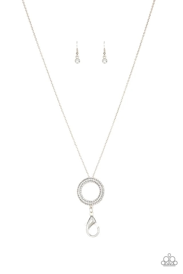 Encrusted in row after row of blinding white rhinestones, a glittery silver hoop swings from the bottom of a lengthened silver chain for a refined flair. A lobster clasp hangs from the bottom of the design to allow a name badge or other item to be attached. Features an adjustable clasp closure. Sold as one individual lanyard. Includes one pair of matching earrings.