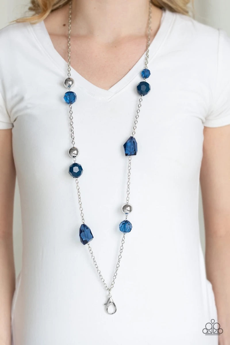 A collection of faceted blue gems, opaque blue beads, and polished silver beads trickle down a shimmery silver chain for a glamorous look. A lobster clasp hangs from the bottom of the design to allow a name badge or other item to be attached. Features an adjustable clasp closure.