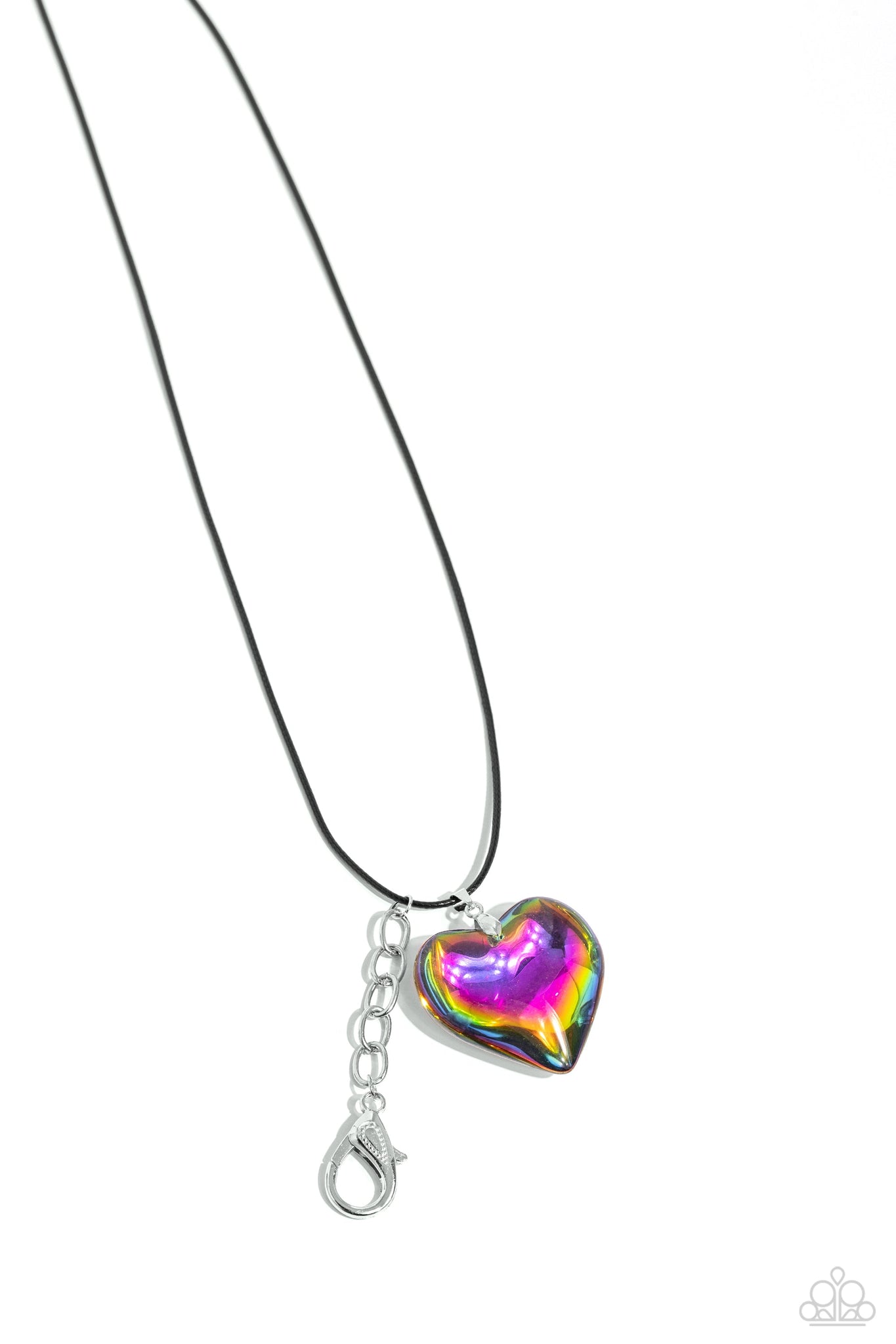 Wrapped in an oil spill finish, an oversized heart pendant glides along a lengthened strand of black cord across the chest for a stellar flair. A lobster clasp hangs from the bottom of the design to allow a name badge or other item to be attached. Features an adjustable clasp closure.