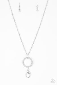 Encrusted in dazzling white rhinestones, a shimmery silver hoop swings from the bottom of an elegantly elongated silver chain for a refined look. A lobster clasp hangs from the bottom of the design to allow a name badge or other item to be attached. Features an adjustable clasp closure. Sold as one individual lanyard. Includes one pair of matching earrings.