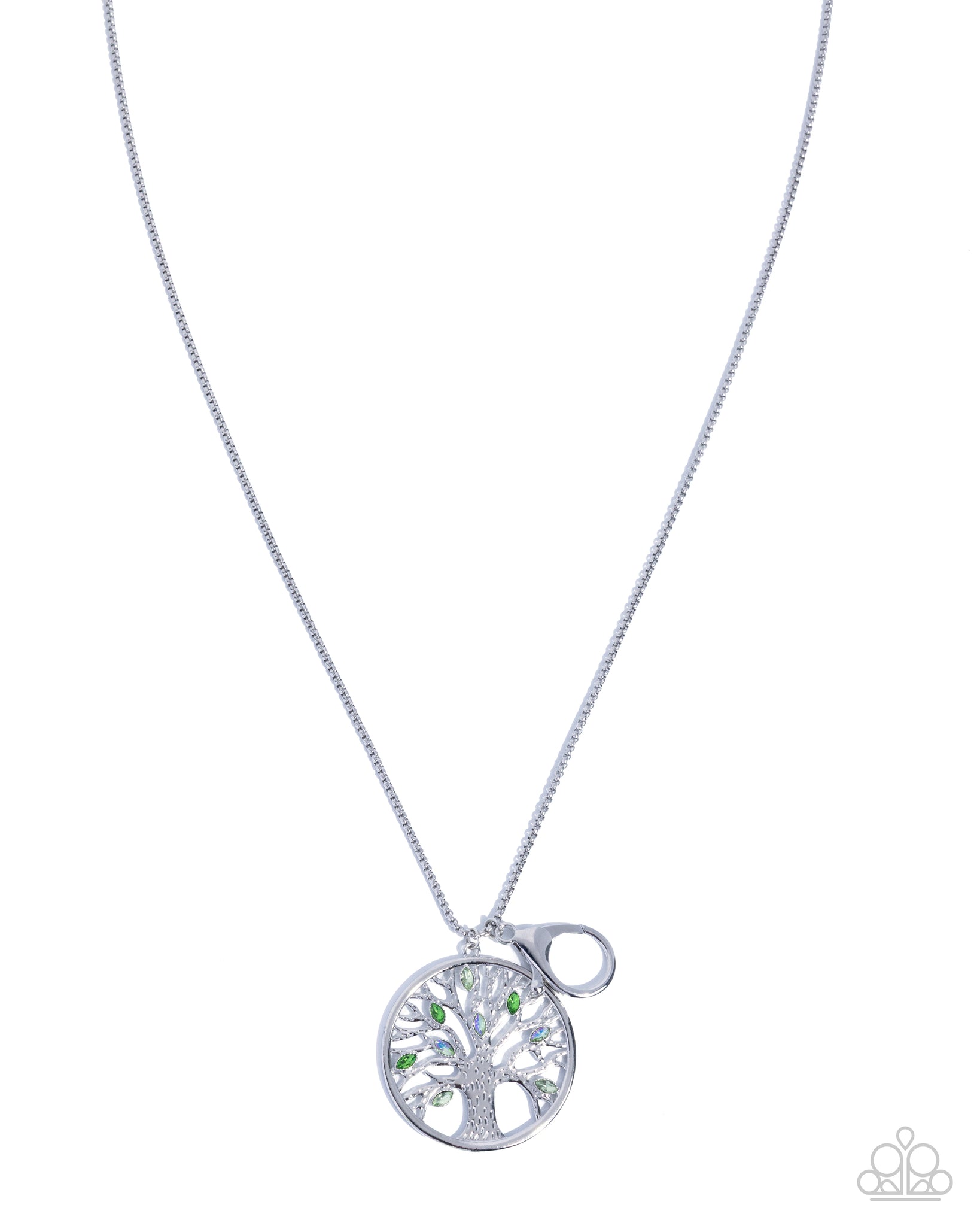 Featuring marquise-cut green multicolored and UV-shimmery gem leaves, a hammered, oversized silver tree pendant glides along an elongated silver box chain for a wildly whimsical display. A lobster clasp hangs from the bottom of the design to allow a name badge or other item to be attached. Features an adjustable clasp closure.
