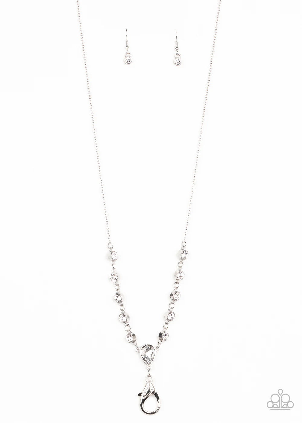 A sparkly series of glassy white rhinestones gives way to an oversized white rhinestone teardrop pendant at the bottom of a dainty silver chain. A lobster clasp hangs from the bottom of the design to allow a name badge or other item to be attached. Features an adjustable clasp closure.