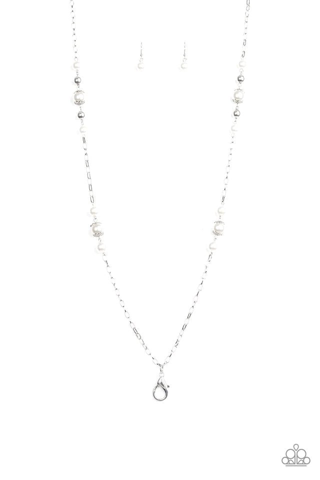 Capped in ornate silver frames, a collection of bubbly white pearls and glistening silver beads trickle along sections of a shiny silver chain across the chest for a timeless sophistication. A lobster clasp hangs from the bottom of the design to allow a name badge or other item to be attached. Features an adjustable clasp closure. Sold as one individual lanyard. Includes one pair of matching earrings.