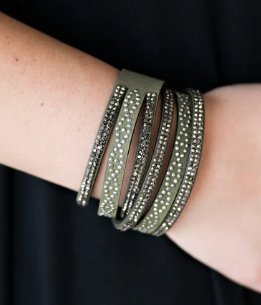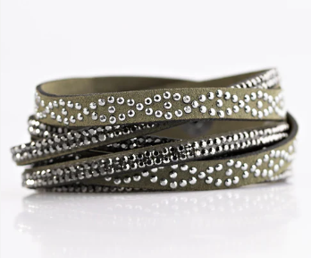 A mishmash of hematite rhinestones and faceted silver beads are sprinkled along strands of green suede for a sassy look. The elongated design allows for a trendy double wrap around the wrist. Features an adjustable snap closure.