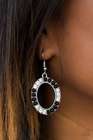 Dainty black beads and glittery white rhinestones are encrusted along a beveled silver hoop, creating an elegant lure. Earring attaches to a standard fishhook fitting.