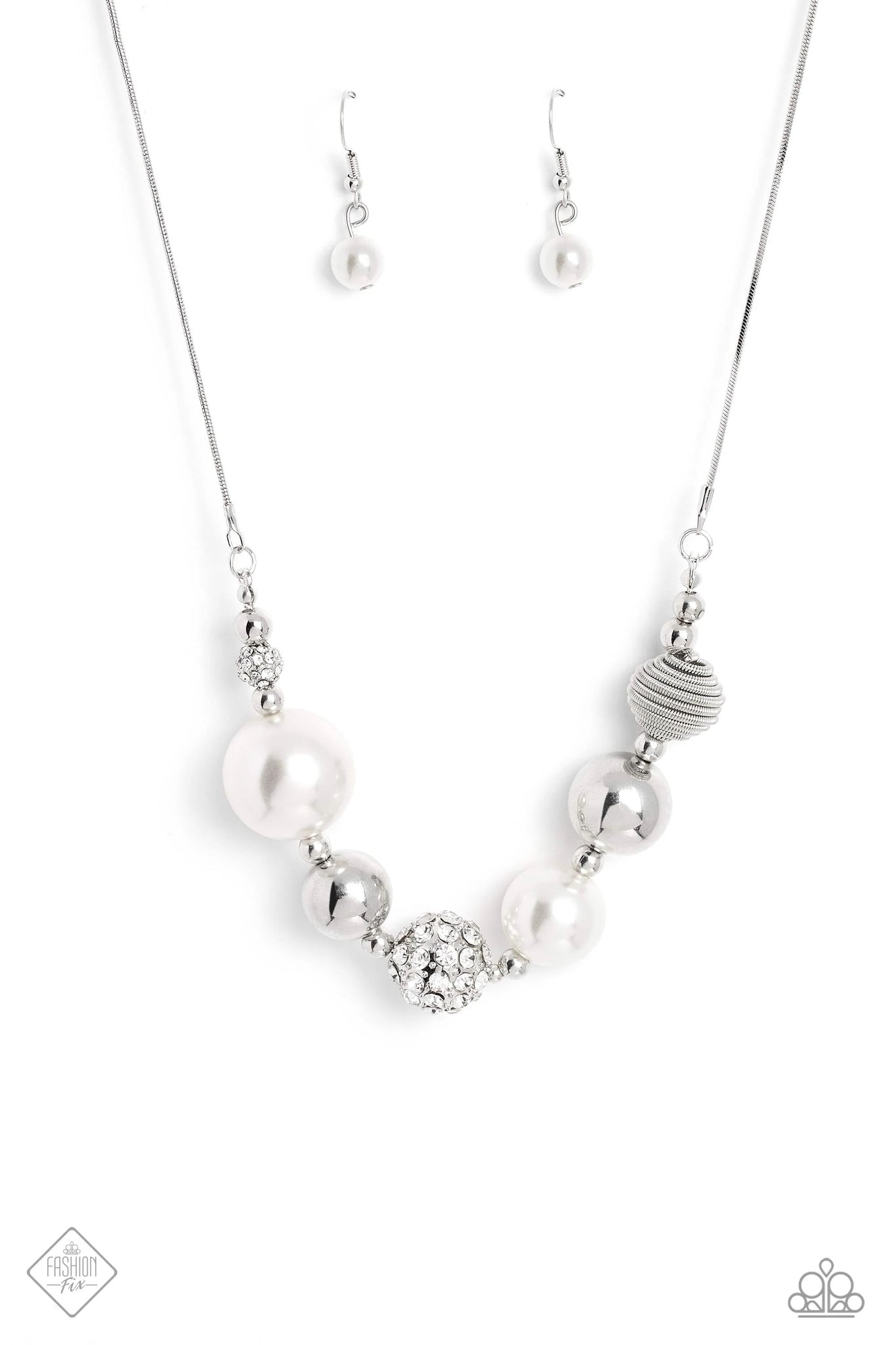 Exaggerated white pearls and silver beads, silver studs, a white rhinestone-encrusted sphere, and a silver ball with textured spirals dance along the collar, connecting to a silver serpentine chain in a showcase of glitz and elegance. Features an adjustable clasp closure.