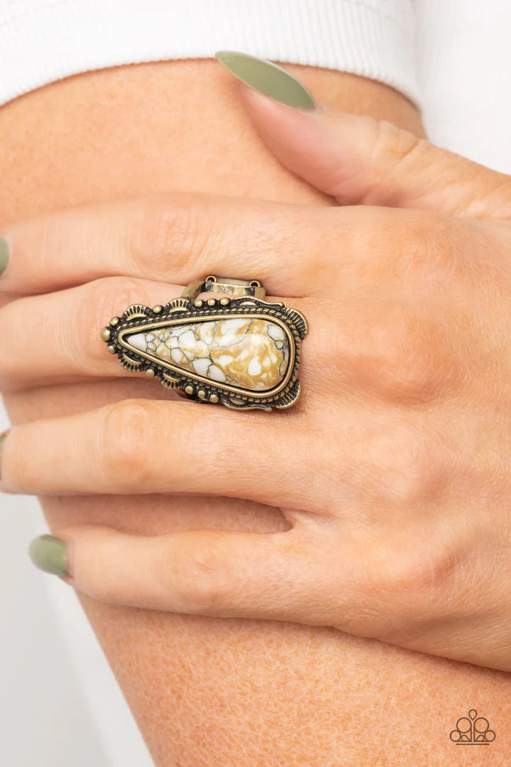 Infused with brassy shimmer, an oversized white teardrop stone is nestled inside a brass frame studded and embellished in antiqued brass details for an authentic finish. Features a stretchy band for a flexible fit.