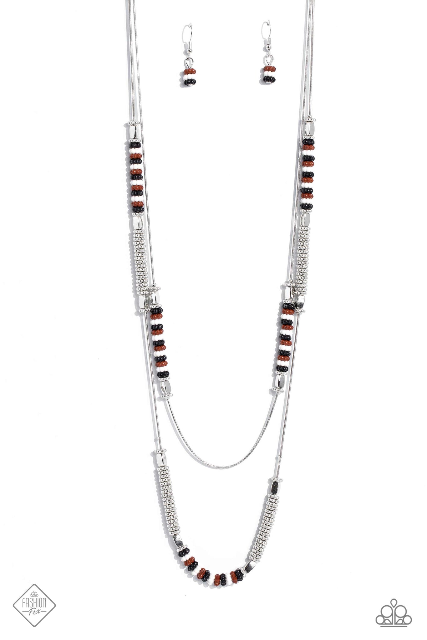Featuring a layered display, two elongated silver snake chains dance down the neckline. Sections of shiny silver flower beads, capped by high sheen silver accents, are interspersed with stacks of white, Caramel Café, black, and silver studded beads, creating a bubbly, fanciful finish in rich neutral shades. Features an adjustable clasp closure.