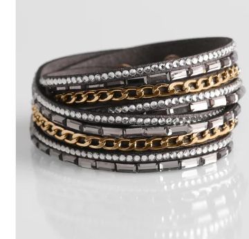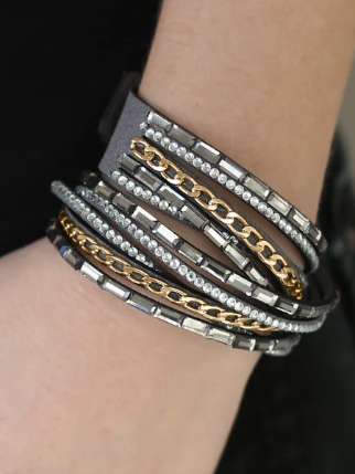 Rows of glassy emerald-cut rhinestones, a glistening gold chain, and glittery white rhinestones are pressed along three strands of gray suede for a sassy look. The elongated band allows for a trendy double wrap design. Features an adjustable snap closure.