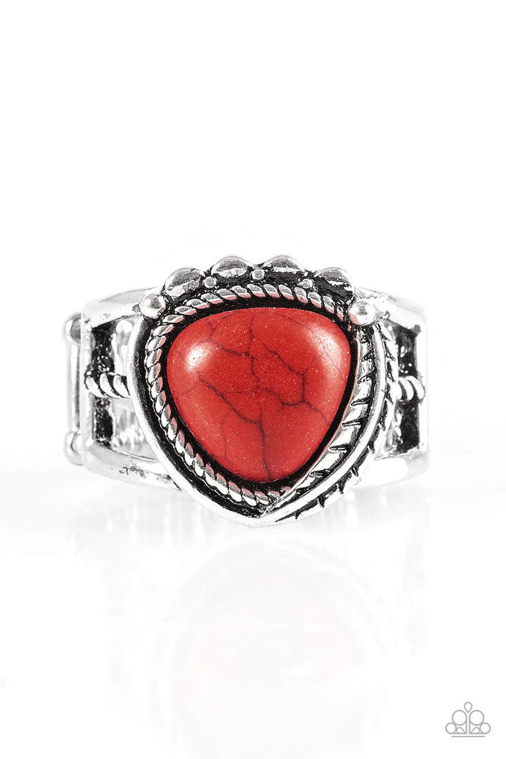 Chiseled into a triangular shape, a fiery red stone is pressed into the center of an ornate silver frame for a seasonal look. Features a stretchy band for a flexible fit.