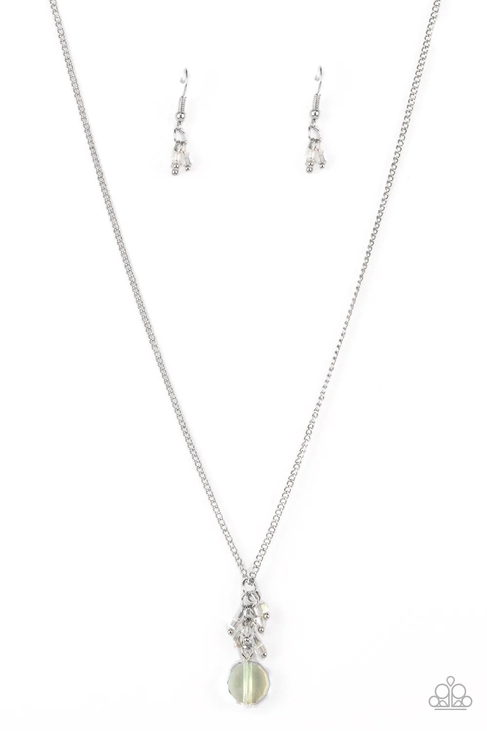 A faceted iridescent gem-like bead swings from the bottom of a beaded tassel, creating a twinkly pendant below the collar. Features an adjustable clasp closure.