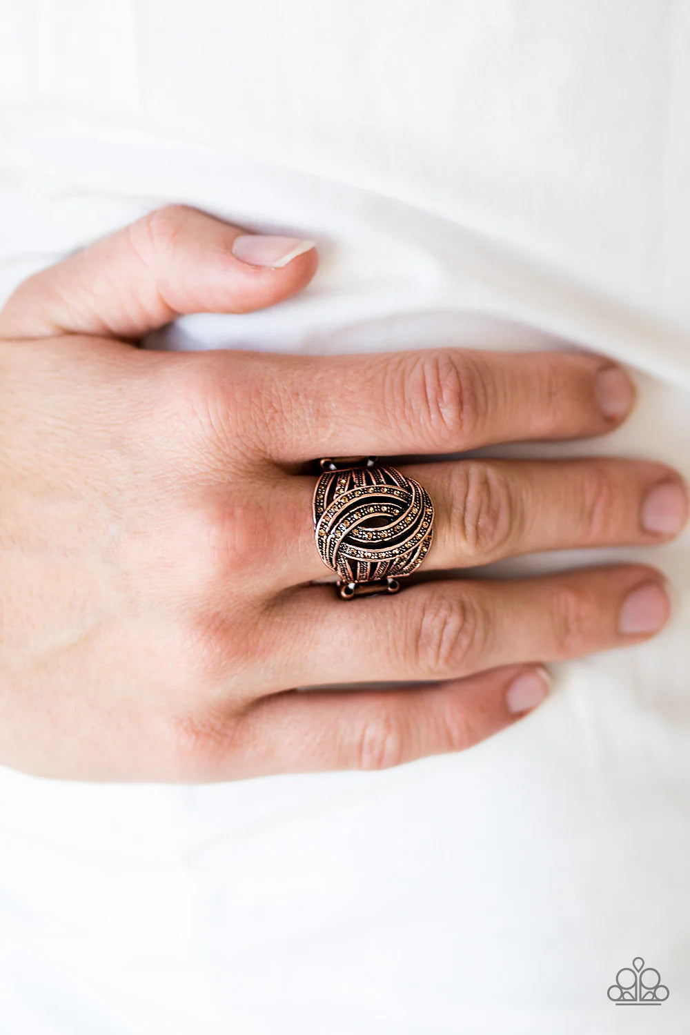 Ribbons of copper loop across the finger, creating a refined frame. Dainty topaz rhinestones are sprinkled across the textured copper bars, adding a refined shimmer to the elegant band. Features a stretchy band for flexible fit.