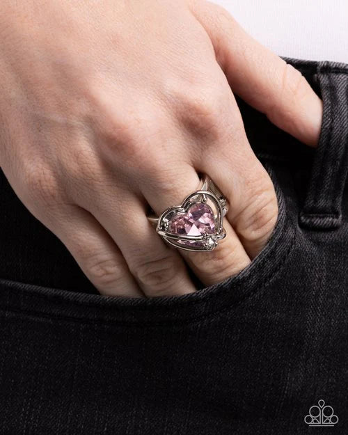 Pronged in the center of an airy silver heart frame, a pink cubic zirconia heart glistens atop the finger for a romantic centerpiece. A solitaire, silver-pronged white rhinestone dots across a bar of silver that crisscrosses atop the heart frame for a Cupid-inspired finish. Features a stretchy band for a flexible fit.