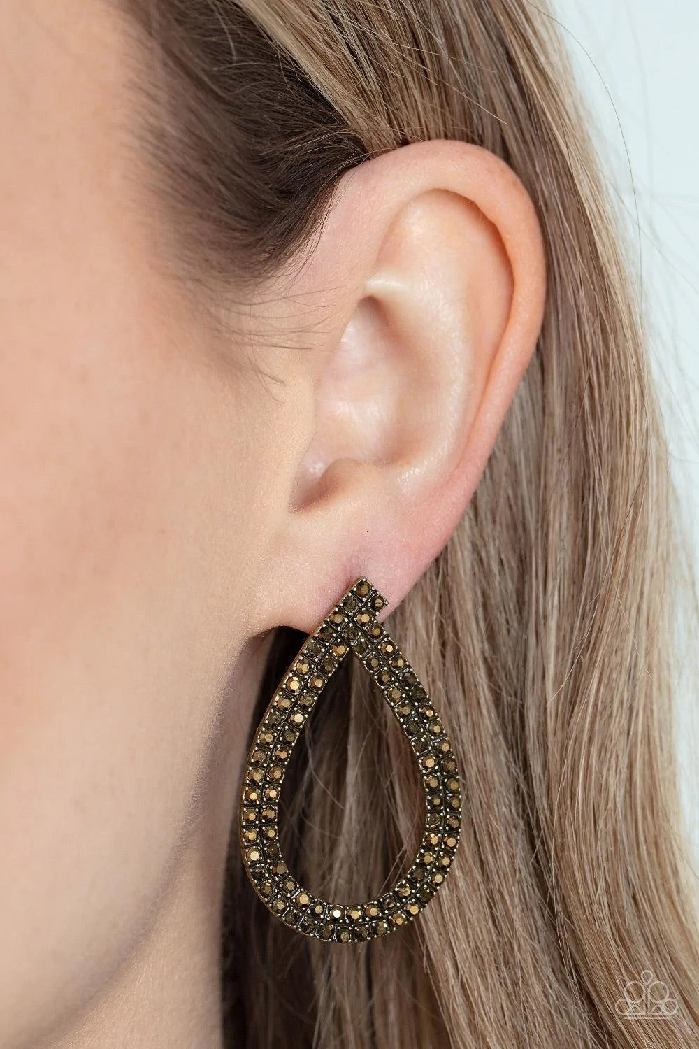 Glitzy ribbons of dainty aurum rhinestones delicately swoop into a gritty teardrop frame, resulting in a sultry sparkle. Earring attaches to a standard post fitting.