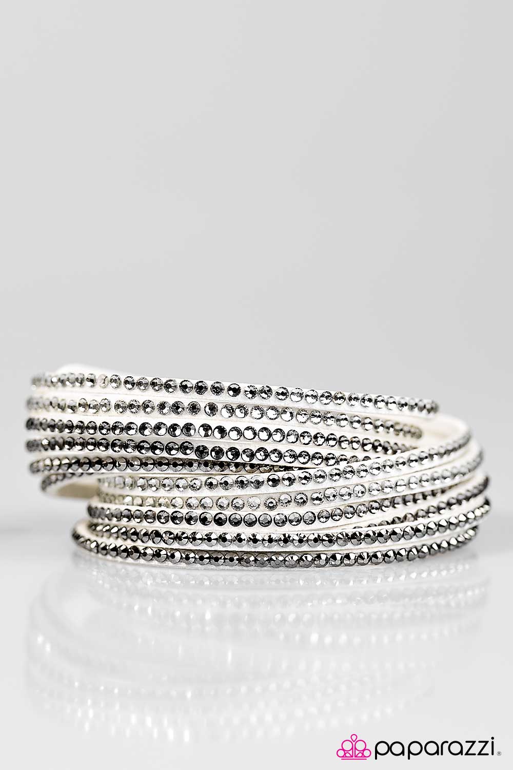 White suede is spliced into six strands and embellished with rows of hematite, white, and smoky rhinestones for a glitzy combination. The elongated suede band allows for a trendy double wrap design. Features an adjustable snap closure.