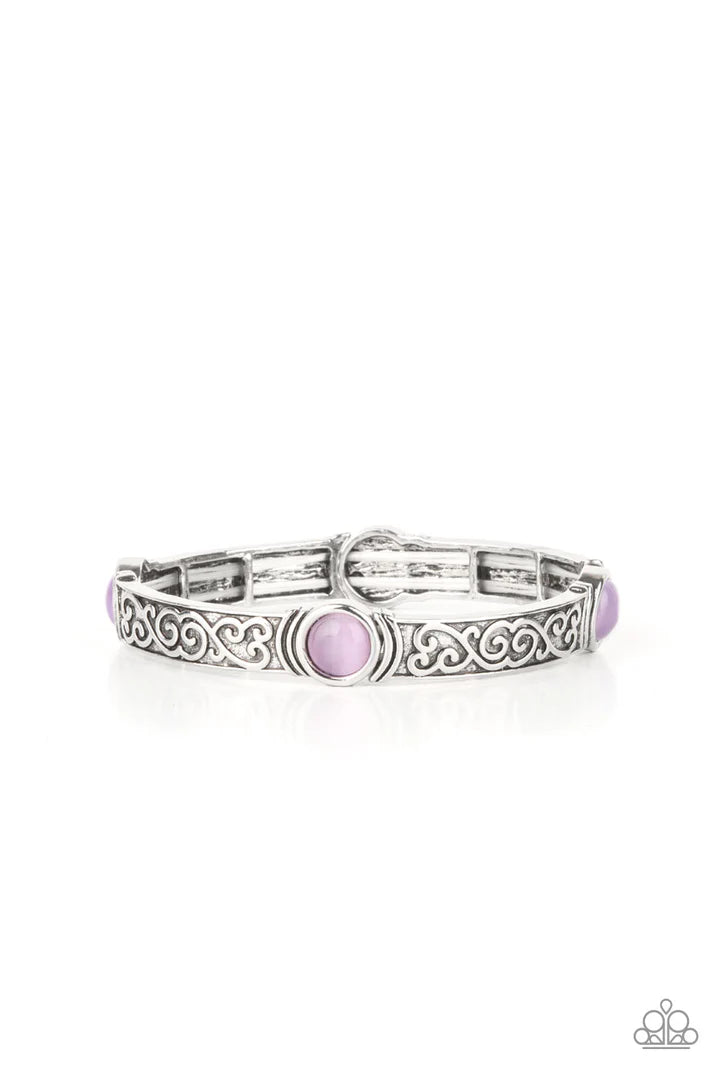 A purple cat's eye stone is pressed into a round frame at the end of a silver bar. Embossed with a whimsical vine motif, the patterned bars are threaded on stretchy bands to repeat around the wrist for an enchanting finish.