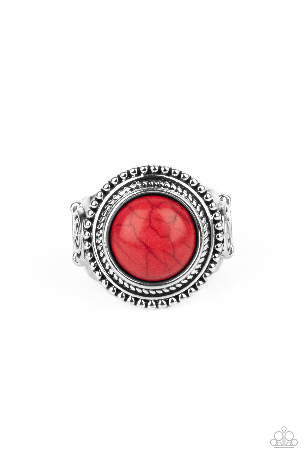 A round red stone is pressed into the center of a studded silver frame embossed with rustic swirls, creating a trendy tribal inspired centerpiece atop the finger. Features a stretchy band for a flexible fit.