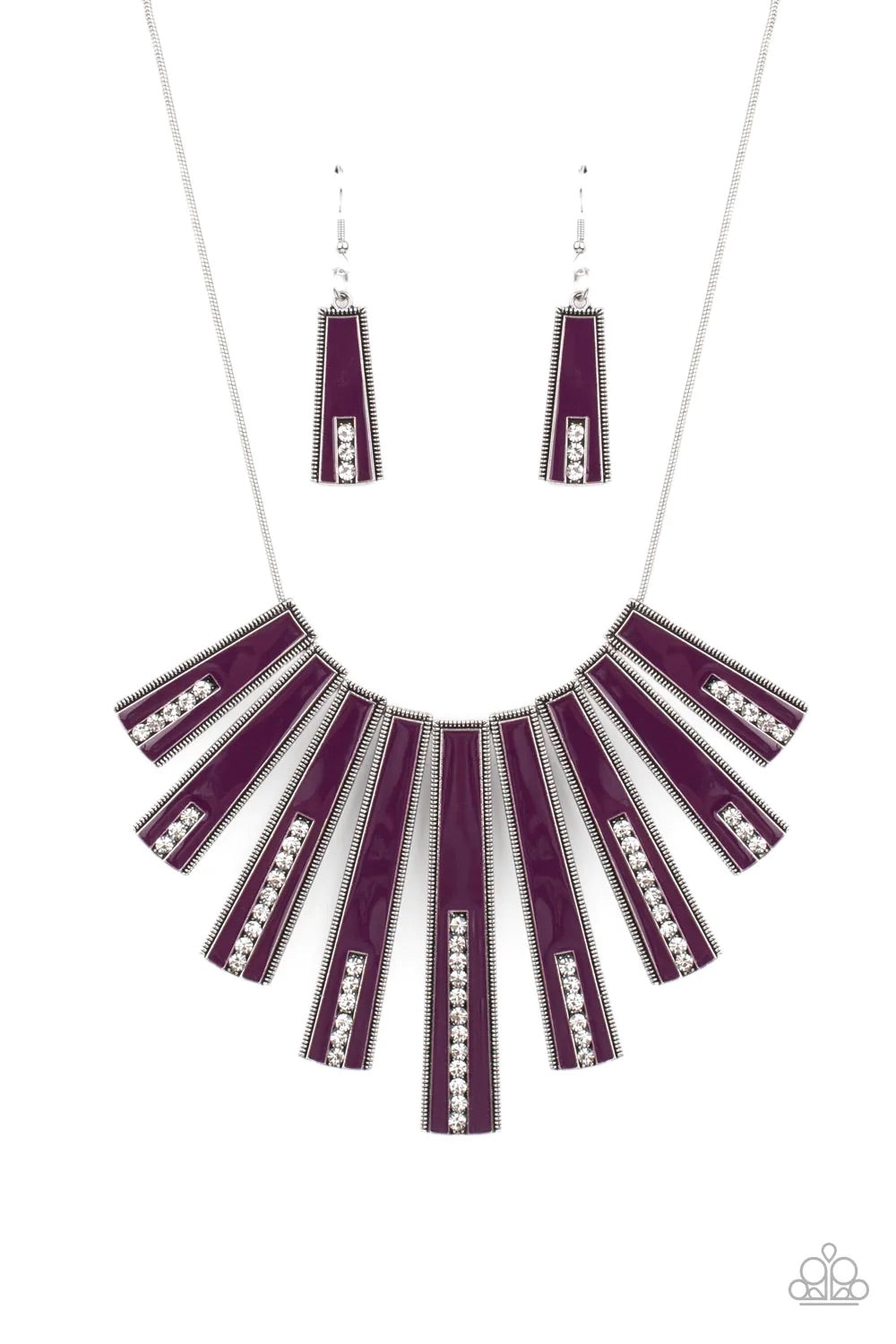 Encased in daintily dotted silver frames, a row of flared silver bars painted in a glossy purple, fans out across the collar. A column of sparkling white rhinestones rises from the bottom of each frame, creating a dramatically deco finish as they sway from a round silver chain. Features an adjustable clasp closure.