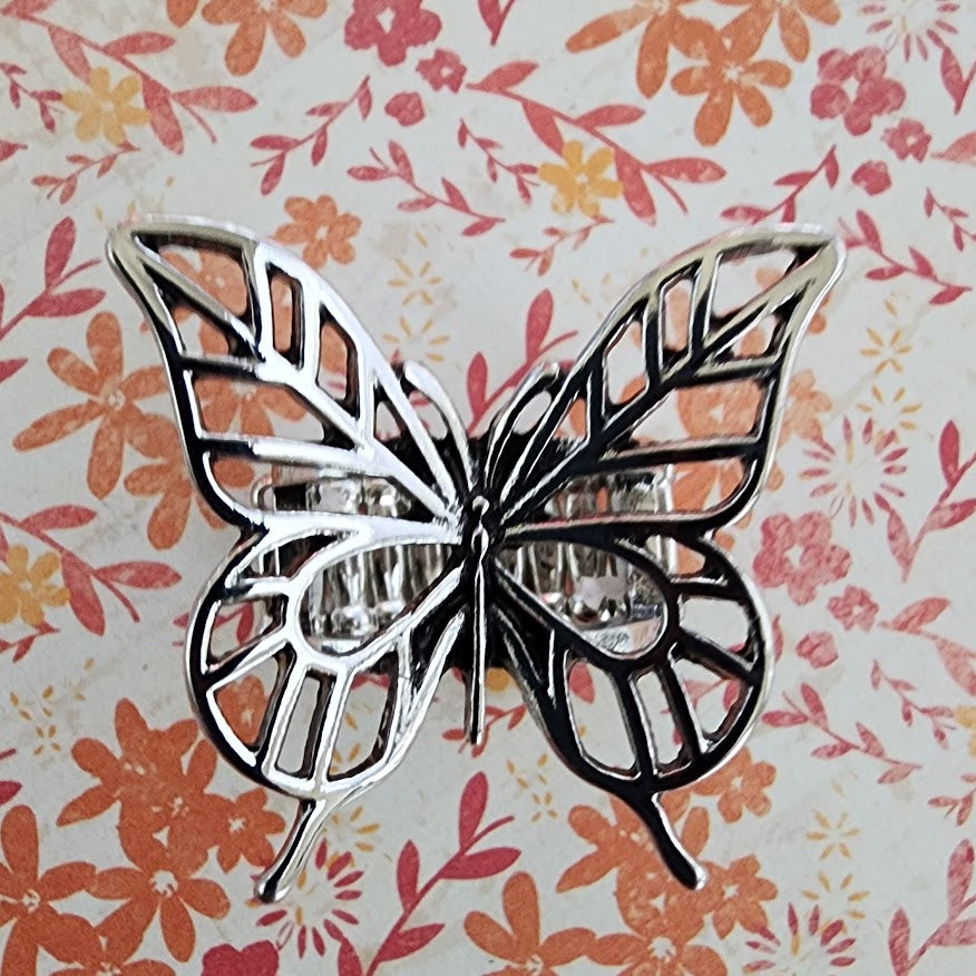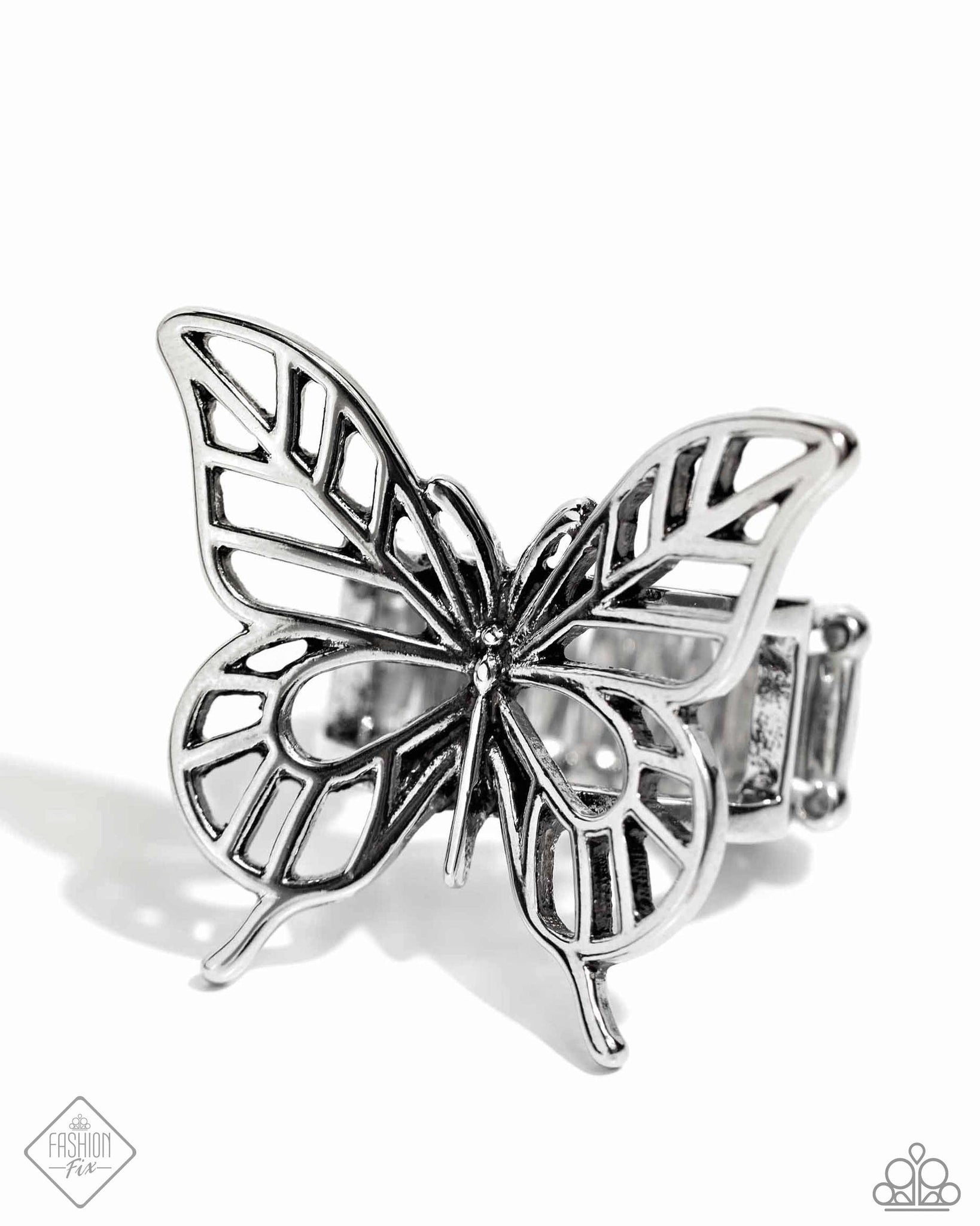 Featuring high-sheen detailing, an intricate silver butterfly flutters atop the finger for a whimsical centerpiece. Features a stretchy band for a flexible fit.
