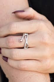 Encrusted in sections of glittery white rhinestones, a glistening ribbon of silver wraps around the finger. A classic brown pearl dots the end of the swooping bar, adding a refined finish to the timeless look. Features a dainty stretchy band for a flexible fit.