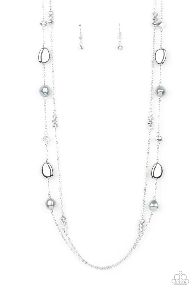 A dainty silver chain adorned in trios of hematite flecked crystal-like beads layers with a chain dotted with matching crystal-like accents and imperfect silver and pearly beads across the chest for a refined flair. Features an adjustable clasp closure.
