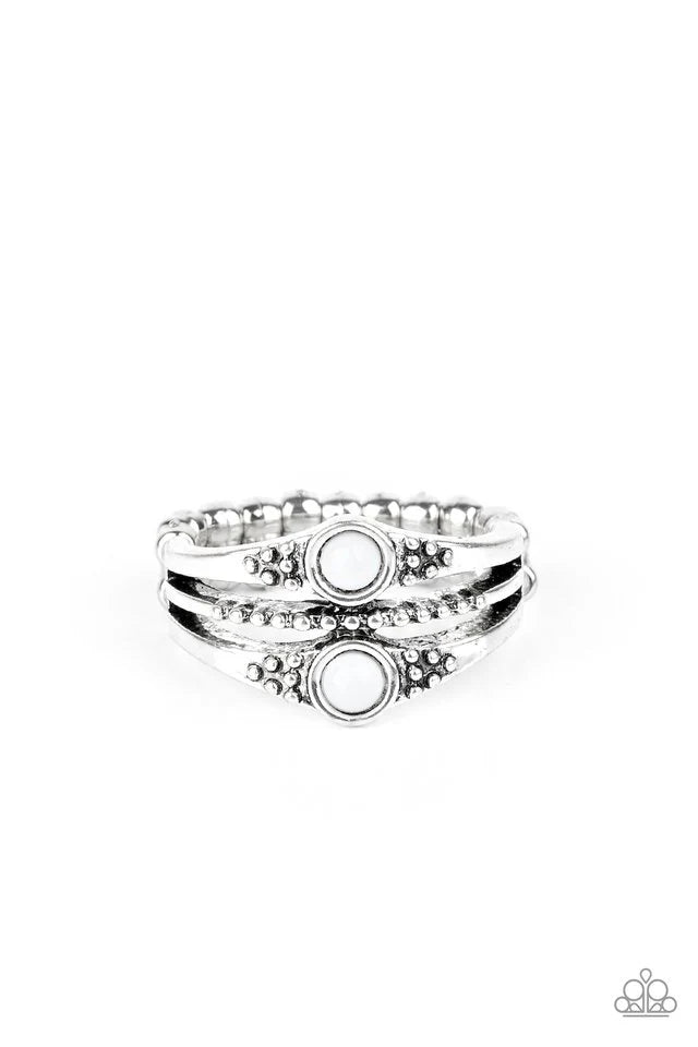 Dotted in shimmery silver studs, antiqued silver bands stack across the finger. Two shiny white beads are pressed into the upper and lower bands for a colorful finish. Features a dainty stretchy band for a flexible fit.