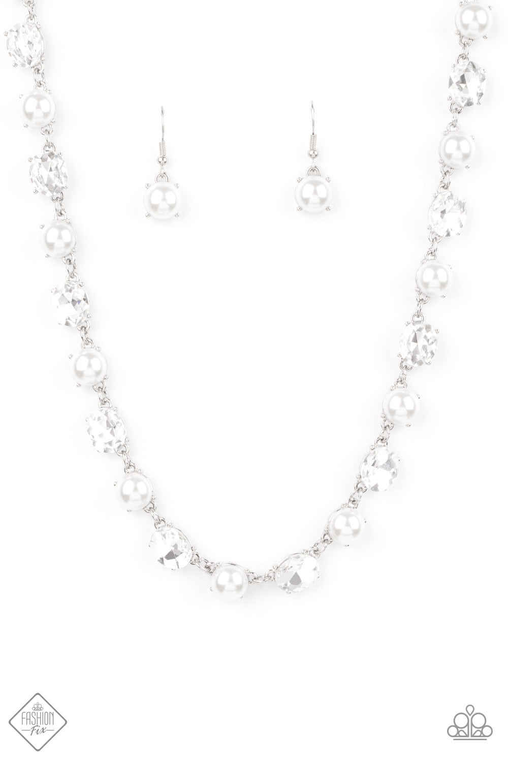 Encased in sleek silver fittings, a classic array of bubbly white pearls and glassy white rhinestones delicately link below the collar in a statement making finish. Features an adjustable clasp closure.