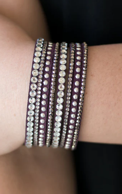 A mishmash of smoky, white, and glittery hematite rhinestones are sprinkled along skinny strands of purple suede. Rows of shiny silver studs are added to the rock star palette for a shimmery metallic finish. Features an adjustable snap closure.