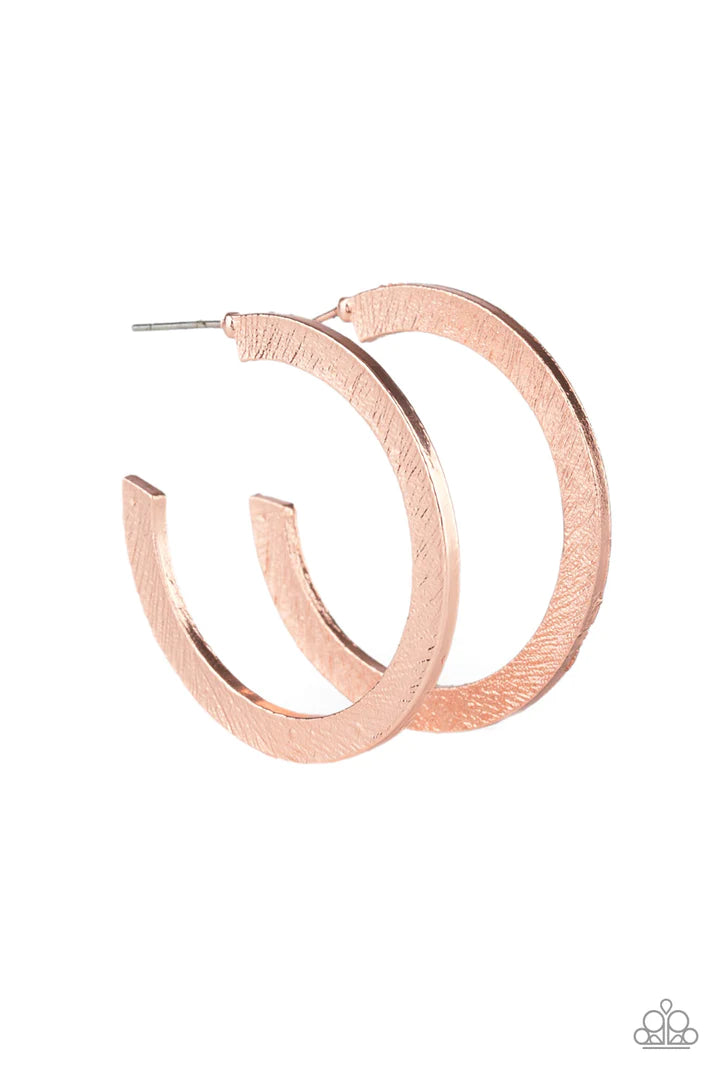 A classic copper hoop is brushed in a high sheen finish, catching the light as it curls around the ear. Earring attaches to a standard post fitting. Hoop measures approximately 1 1/2" in diameter.