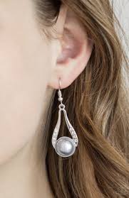 A pearly silver bead is nestled along the bottom of an elegant silver frame radiating with glassy white rhinestones for a timeless look. Earring attaches to a standard fishhook fitting.