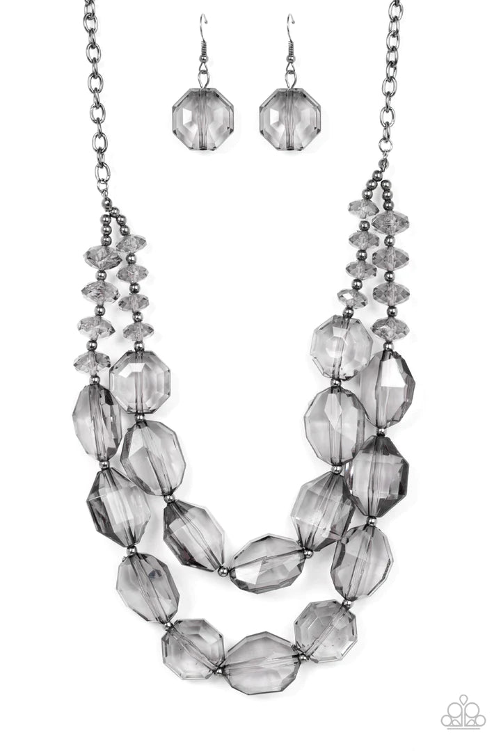 Separated by dainty silver beads, an icy collection of oversized and faceted smoky gems are threaded along invisible wires below the collar, resulting in prismatic layers. Features an adjustable clasp closure.