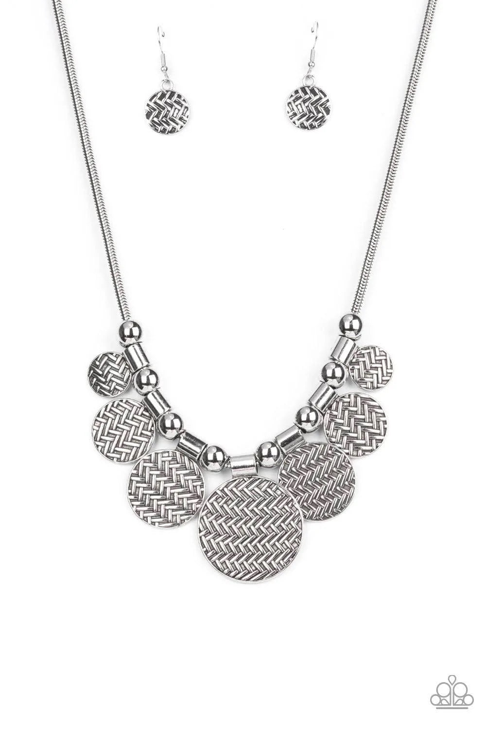 Embossed in metallically stitched patterns, silver discs gradually increase in size as they alternate with chunky silver beads along a round silver snake chain, creating a noise-making fringe below the collar. Features an adjustable clasp closure.