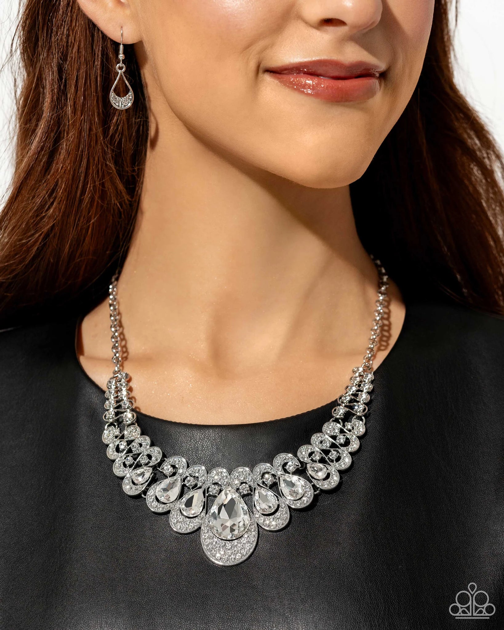 Pressed in thin, curly silver infinity-like frames, solitaire white rhinestones gradually elongate into faceted shimmery teardrop gems. A collection of dainty, airy white rhinestones dusts the caps of each teardrop frame for additional glitz and glamor. Features an adjustable clasp closure.