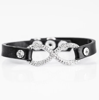 A skinny strip of black leather attaches to a silver infinity symbol encrusted in glittery rhinestones. Flanked by two dazzling solitaire rhinestones, the glitzy design creates an incandescent centerpiece. Features an adjustable snap closure.