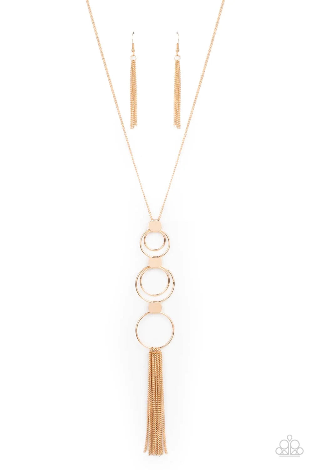 A set of concentric gold circles connected by flat discs swings from a lengthened gold chain. A soft fringe sways from the bottom ring for an elemental approach. Features an adjustable clasp closure.