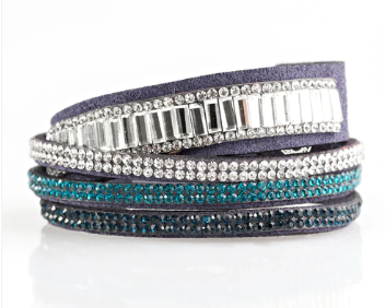Encrusted in mismatched sparkle, half of a blue suede band is encrusted in white emerald style cut rhinestones, while the other half splits into three separate bands encrusted in white and blue rhinestones for a sassy look. The elongated band allows for a trendy double wrap design. Features an adjustable snap closure.
