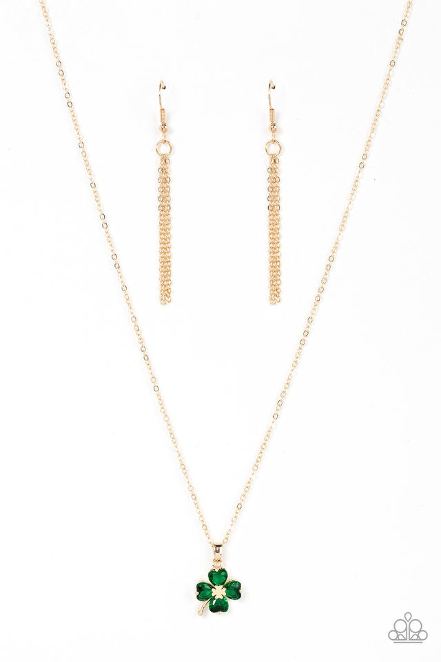Sparkling with glittery greenrhinestones, a golden clover pendant glides along a dainty gold chain below the collar for a dazzling dash of St. Patrick's Day inspiration. Features an adjustable clasp closure.