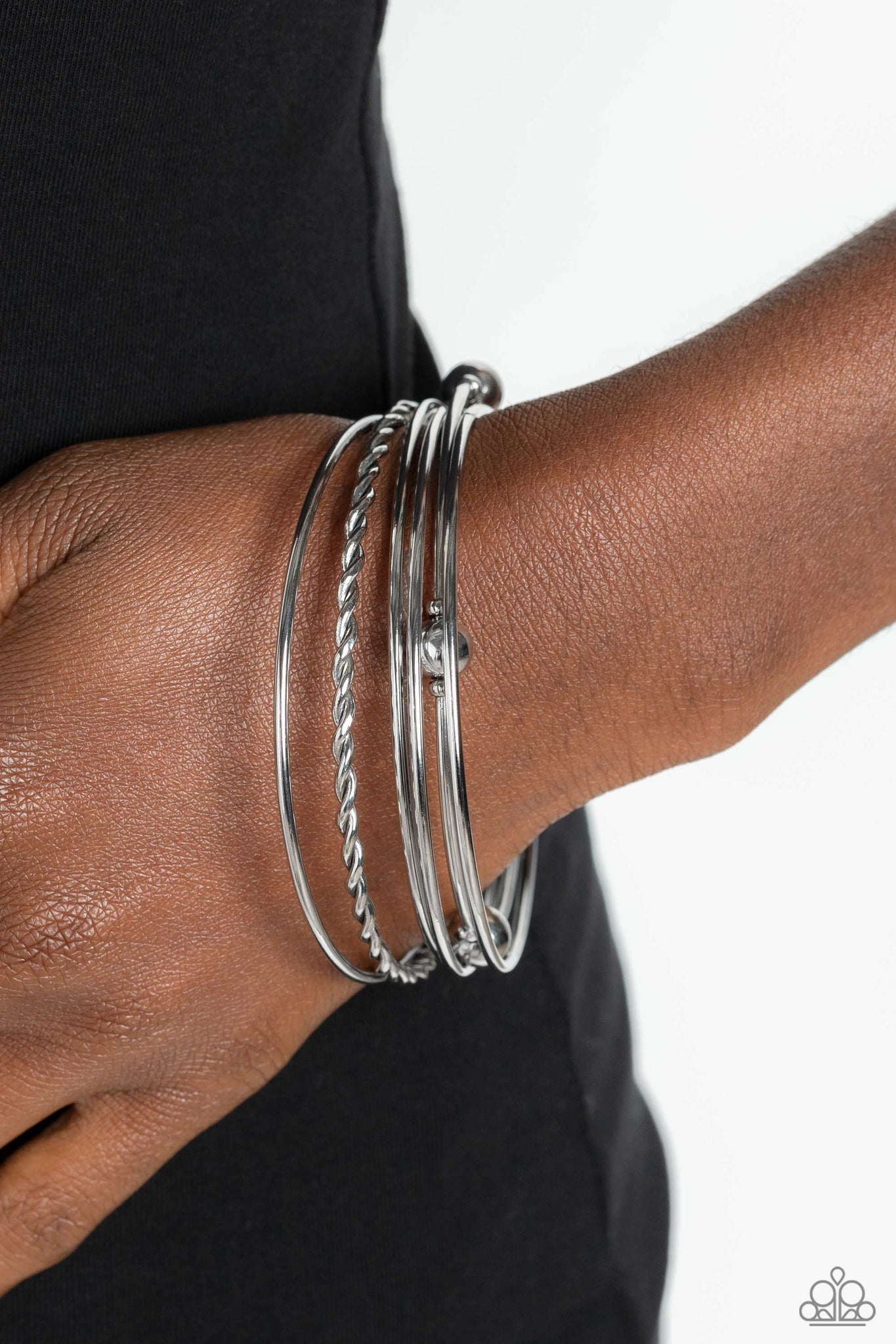A collision of shiny silver bangles slides up and down the wrist for an industrially-layered look. One thin bangle features a braided texture, while another bangle features static silver accents and spheres for a subtle, eye-catching artisan touch.